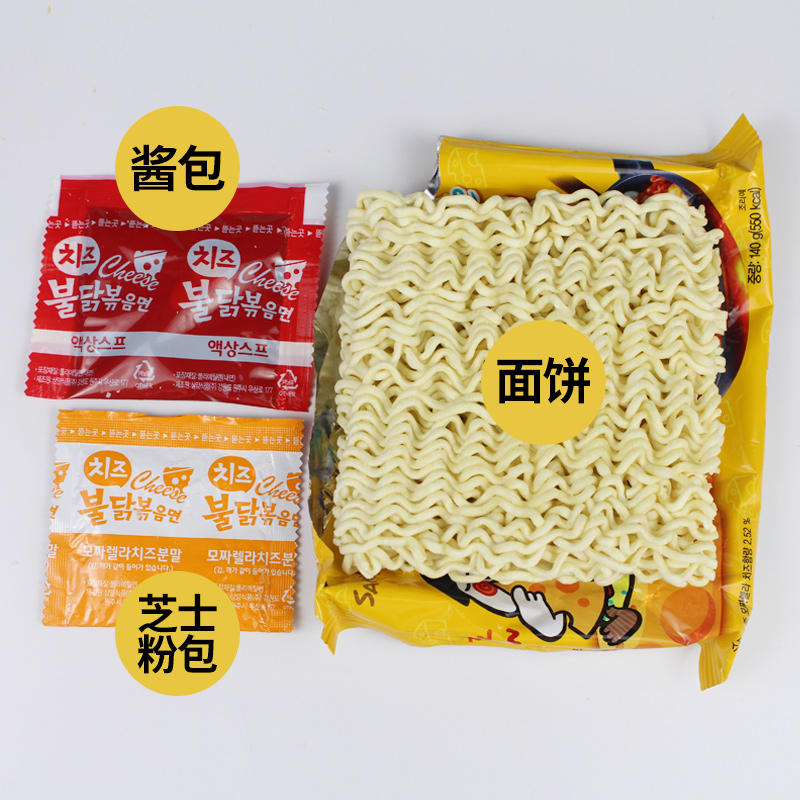 与原味的黑色包装不同,芝士味的包装很鲜亮,黄色的包装上印着一只三养火鸡抱着大块芝士。而且料包也比原味多一袋芝士粉包~