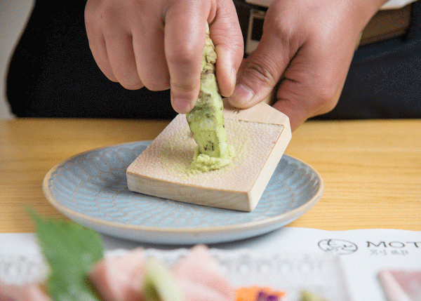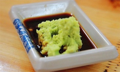 山葵酱不能放在酱油里搅拌,否则一瞬间味道就被破坏了。有品的吃法应该是蘸一小撮卷在生鱼片里面,然后夹起生鱼片用另外一面蘸酱油,再把包着山葵酱的鱼生送进嘴里,不可以让酱油和山葵有直接的接触。研磨山葵的磨板可以很讲究,最极致的就是用鲨鱼皮粘在木板上的"鲛鲨鱼皮磨板"。大家可以自行搜索看一下这个磨板到底是长什么样的。我了解到这些个人觉得还是青芥辣比较方便,毕竟现在生活的节奏都普遍较快,我觉得大家还是觉得青芥辣比较方便吧!